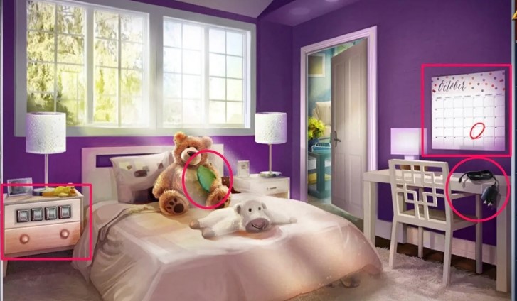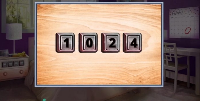 After that, scan the room for useful items. Grab the third puzzle piece from the table. Take the phone charger lying nearby. Look at the calendar on the wall and notice October 24 circled in red. Think of the date as 10/24 and head to the locked drawer. Enter 1024 into the drawer lock to open it. Check inside and find a locked diary.