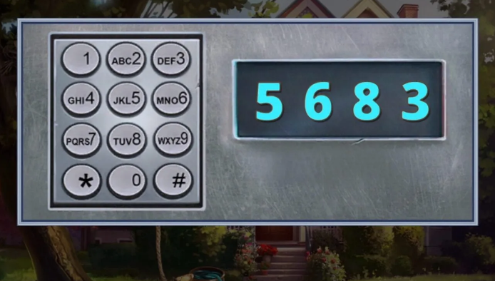 Then go back down and tap on the front door. Notice the keypad asking for a PIN code. Look closely at the letters L, O, V, and E on the keypad and see that they match the numbers 5, 6, 8, and 3. Enter 5683 to unlock the door and go inside.