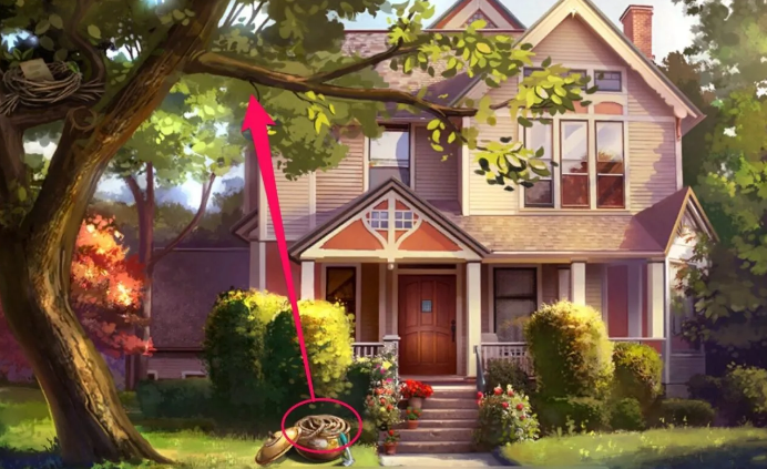 First off, stand outside Melissa’s house and look around. Grab the rope from the ground and throw it over the tree branch above.