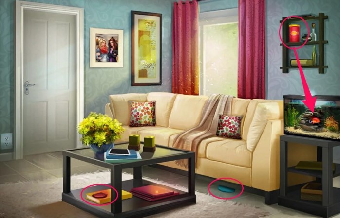 Next, search the room carefully for clues. Pick up the two puzzle pieces you find nearby. Take the fish food sitting close to the tank.