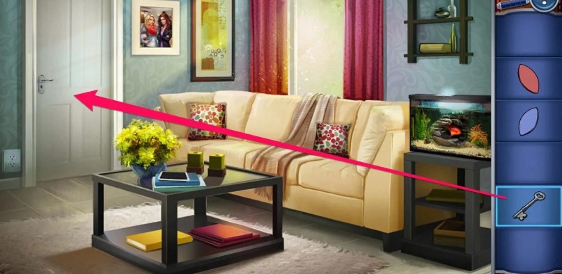 Walk over to the fish tank and pour the fish food inside. Watch the fish move aside and reveal a key at the bottom. Collect the key.