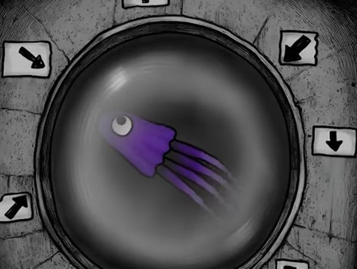 Next, go through the door behind the octopus, reach the frog monster, look at the portrait, and give him the tape.