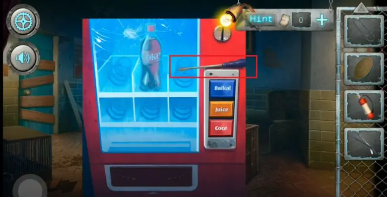 In the telephone booth room, use the key on the fire extinguisher box, then complete the mini-game to get scissors. Head to the hallway, place the red button on the fridge, and collect the screwdriver.